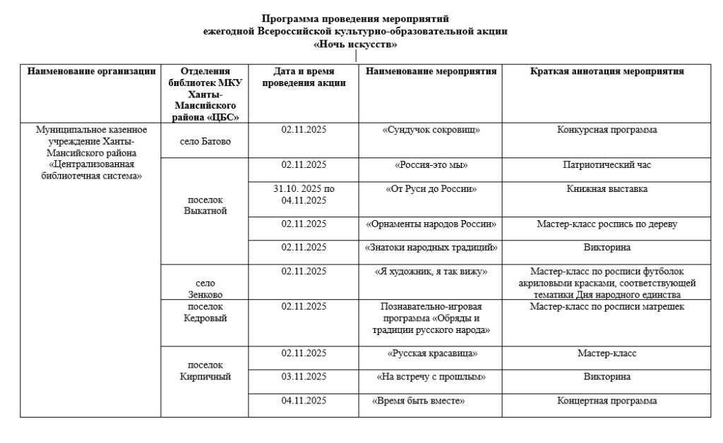 Ханты-Мансийский район готовится к одному из самых ярких культурных событий года – ежегодной «Ночи искусств». В этом году акция пройдет под вдохновляющим девизом «В единстве культур – сила народа», и библиотеки нашего района распахнут свои двери, чтобы подарить вам незабываемые впечатления.